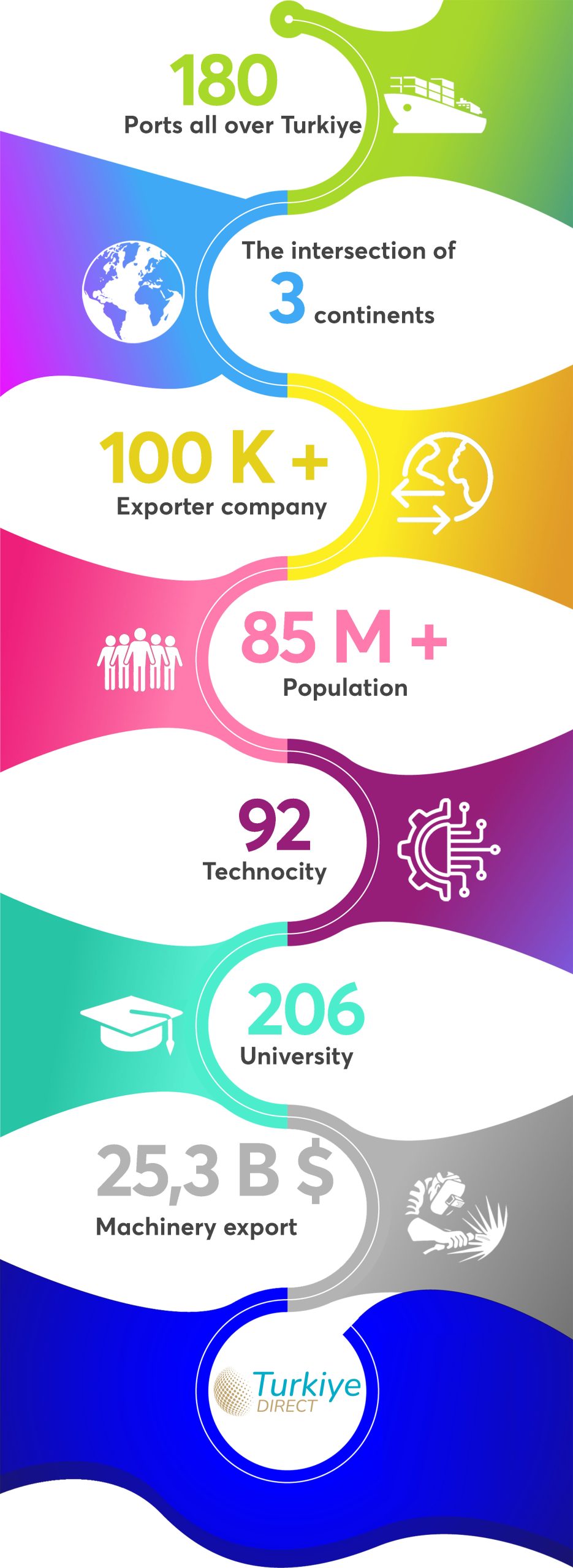 First of all, Turkey’s location facilitates its access to important trade corridors in the world economy. Many large markets such as Europe, Middle East, North Africa, Central Asia and Russia are the regions neighboring Turkey. This enables Turkish companies to have the opportunity to trade with various countries and access a broad customer base.